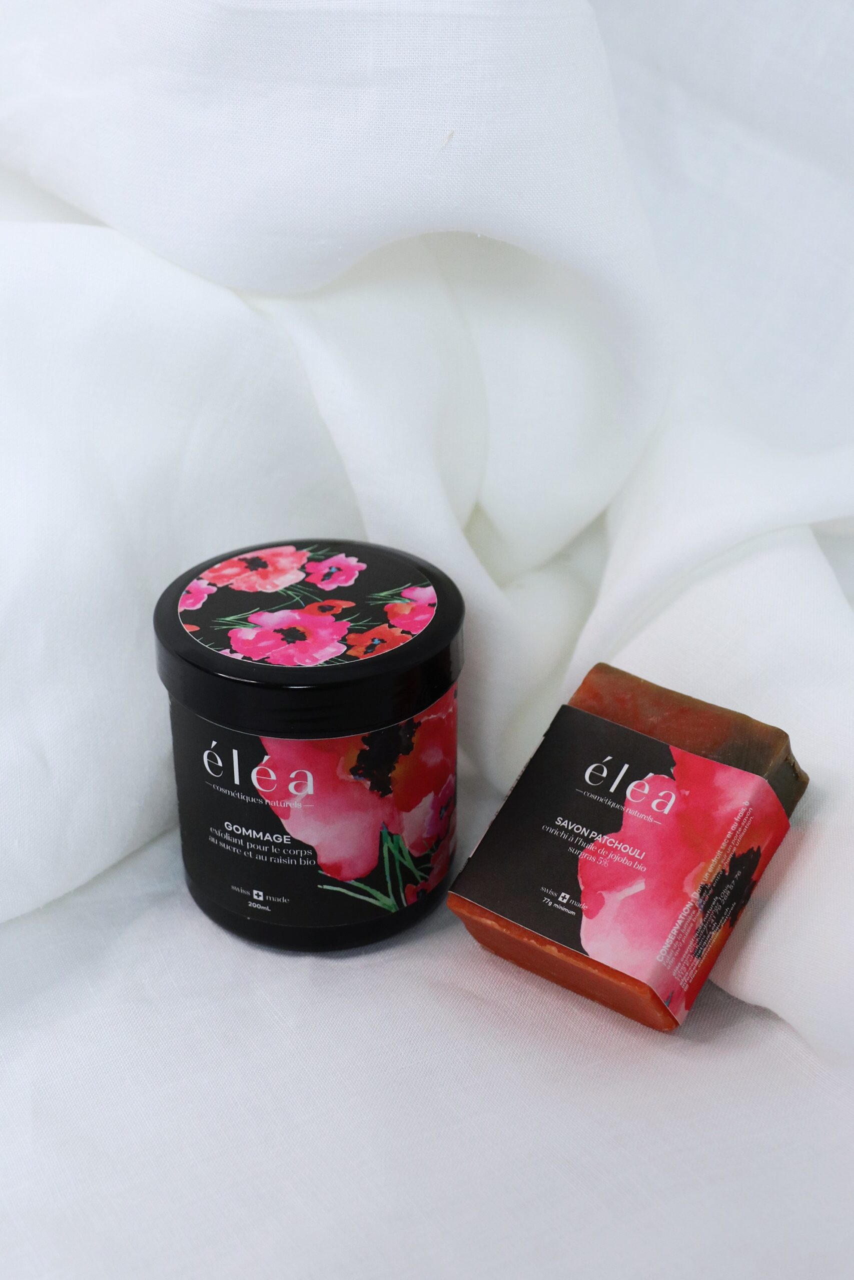 Ce coffret est composé d’un gommage au raisin noir et d’un savon patchouli surgras 5%